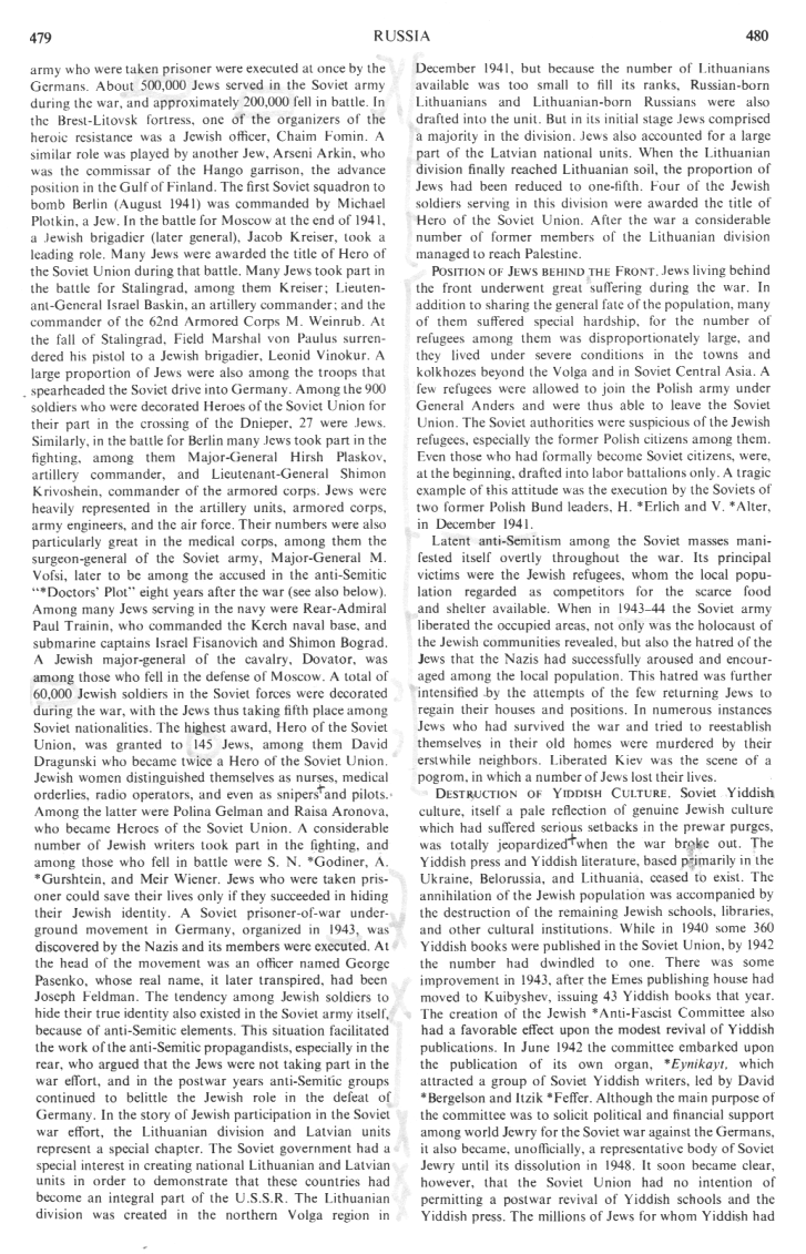 <Jewish soldiers played a leading role in the fighting units in those areas of the Soviet Union which were not occupied by the Germans. There was no question of where their loyalty lay: they were fighting for their lives, and for Jews, unlike Russians such as Vlasov and Ukrainians such as Bandera, treason was out of the question. It was known that Jewish soldiers in the Soviet (col. 478)