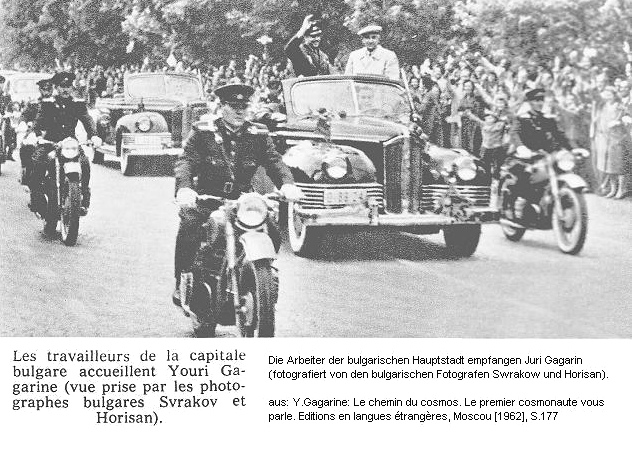 -- Gagarin en Bulgaria: Y. Gagarine: Le chemin du cosmos. Le premier cosmonaute vous parle ["The path into space. The first cosmonaut speaking to you"]. Edition en langues étrangères ["Edition in foreign languages"], Moscou [1962], p.177