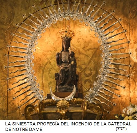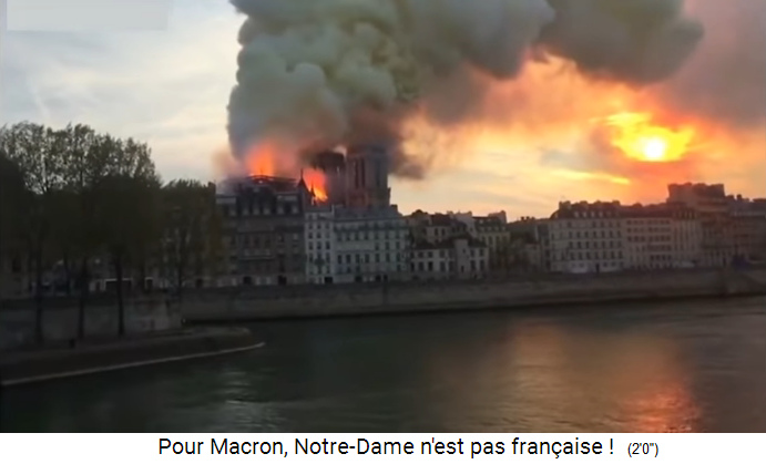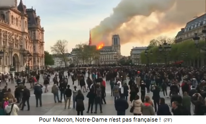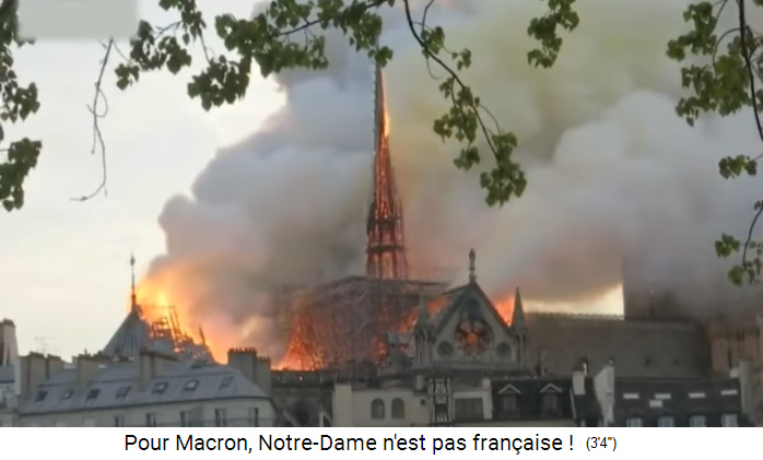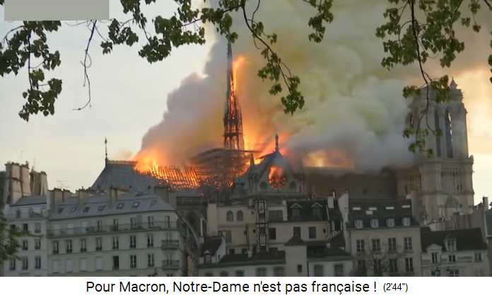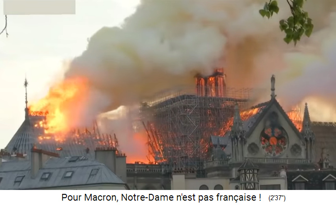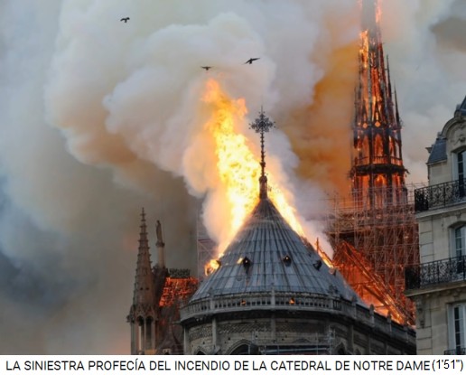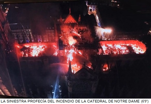 Die [satanistischen] Christen [mit ihren erfundenen Helden und Hexerei-Gebeten] erleiden nun ihre grösste Wunde mit dem Brand von Notre Dame (5'51''). Der Brand der Notre Dame könnte für eine Prophetie für die gesamte katholisch-[satanistische] Welt stehen (5'57''), zuerst mal der architektonische Verlust, und dann der symbolische Verlust, und somit der Verlust des [satanistischen] Christentums in Europa mit dem Verlust der christlich-[satanistischen] Zivilisation (6'11'').