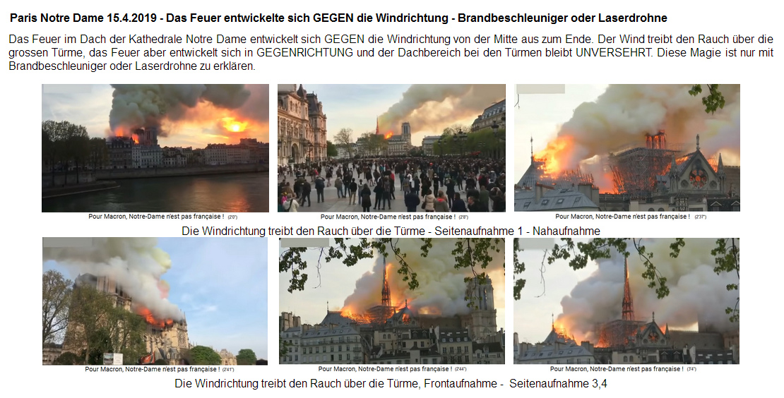 Das Feuer der Notre Dame entwickelte sich GEGEN die Windrichtung - das geht nur mit Brandbeschleuniger oder vor allem mit einer Laserdrohne von oben