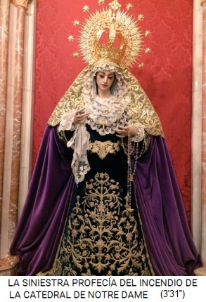 Also das Raumschiff konnte da rausfliegen, und das Feuer war die Ablenkung (6'41''), und das Feuer hat auch gleichzeitig alle Beweise zerstört, niemand konnte hinein und Fotos machen, was da geschah (6'50''). Der Brand der Notre Dame ist das Fanal, dass nun grosse Veränderungen kommen, da kommen "grosse Sachen" ("cosas más gordas"), also da kommen satanistische Rituale, Opfer an die Illuminaten, Sachen der NWO (7'41'').