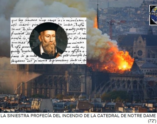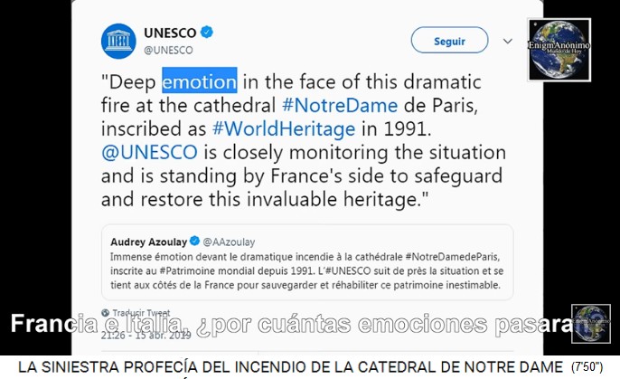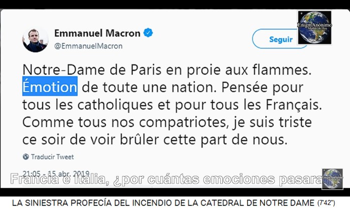 Auch Nostradamus hat den Brand der Notre Dame vorausgesagt (6'58''). Nostradamus-Spezialisten meinen, der Nostradamus habe vor 500 Jahren bereits diesen Brand der Notre Dame vorausgesagt (7'8''): mit einem Kopf des Widders, Jupiter und Saturn, was kann man da noch erwarten? Da war eine lange gute Zeit, und nun kommt das Böse zurück (La cabeza de Aries, Júpiter y Saturno, Dios eterno, ¿qué cambios se pueden esperar después de un largo siglo? El mal regresará) (7'16''). Dabei sollen vor allem in Frankreich und Italien die Emotionen getroffen werden (7'25''). Der [satanistische] Präsident Macron hat es direkt auf Twitter erwähnt "Émotion de toute une nation" (7'42''). Die [satanistische] UNESCO betonte ebenso die "Emotion" auf Twitter: "Deep emotion in the face of this dramatic fire" (7'47'').