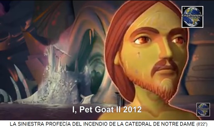 Im Comicfilm "I, Pet Goat II 2012" [mit apokalyptischen Anspielungen] kann man eine Kathedrale erkennen, die zusammenstürzt, so wie der zentrale Turm der Notre Dame einstürzte (8'28''). Das ist ein Symbol, dass die Eliten die Religionen zu Ende gehen lassen wollen (8'32'').