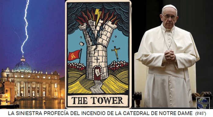 Der kriminell-satanistische Vatikan erhält einen Blitz - die Spielkarte mit dem Turm und dem "V" - der hilflose Satanisten-Jesuiten-Papst Franziskus in Frauenkleidern beim Beten - Die Turmspitze brennt, der Blitzspaltet die Spitze in ein "V"